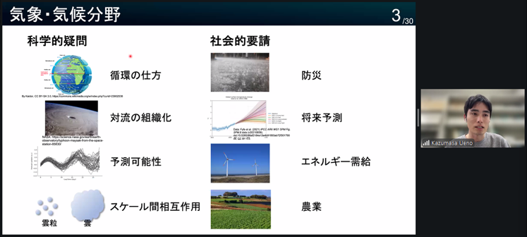上野和雅 (東京大学大学院 理学系研究科 博士課程/株式会社QunaSys リサーチインターン) 「気象・気候分野における量子計算活用の可能性」 気象・気候分野では、数値モデルの高解像度化や大規模アンサンブル化に伴い、古典計算機による計算コストの増大が深刻な課題となっている。量子計算は、量子力学の性質や高い状態表現能力を活かすことで、特定の問題において古典計算を凌駕できる可能性がある一方、気象・気候問題への適用指針は未整備である。本講演では、雲粒分布・流体・定常放射伝達を対象とした量子アルゴリズム設計の取り組みを紹介する。さらに、富岳を用いたシミュレーションによる検証結果と量子計算リソースの見積もり結果を示し、実用化に向けた展望を議論する。