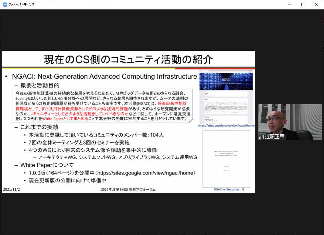 近藤 正章 (慶應義塾大学理工学部 教授/理化学研究所計算科学研究センター チームリーダー) 「次世代高性能計算基盤の開発に向けた計算機科学コミュニティでの活動紹介」 スーパーコンピュータ「富岳」の開発プロジェクト発足にあたっては、計算科学と計算機科学コミュニティが協力してまとめた「今後のHPCI技術開発に関する報告書」が起点となったことは記憶に新しい。次世代の高性能計算機の開発を考えるにあたり、計算科学とAI・ビッグデータ技術のさらなる融合など、新たな展開も期待される一方、ムーアの法則の終焉など多くの技術的課題が待ち受けている。そこで、我々は新たに"NGACI (Next-Generation Advanced Computing Infrastructure)"を発足させ、次世代システムに向けた技術的課題や研究開発要素を検討している。本講演ではNGACIの活動と、そこでまとめられたWhite Paperの内容について紹介する。