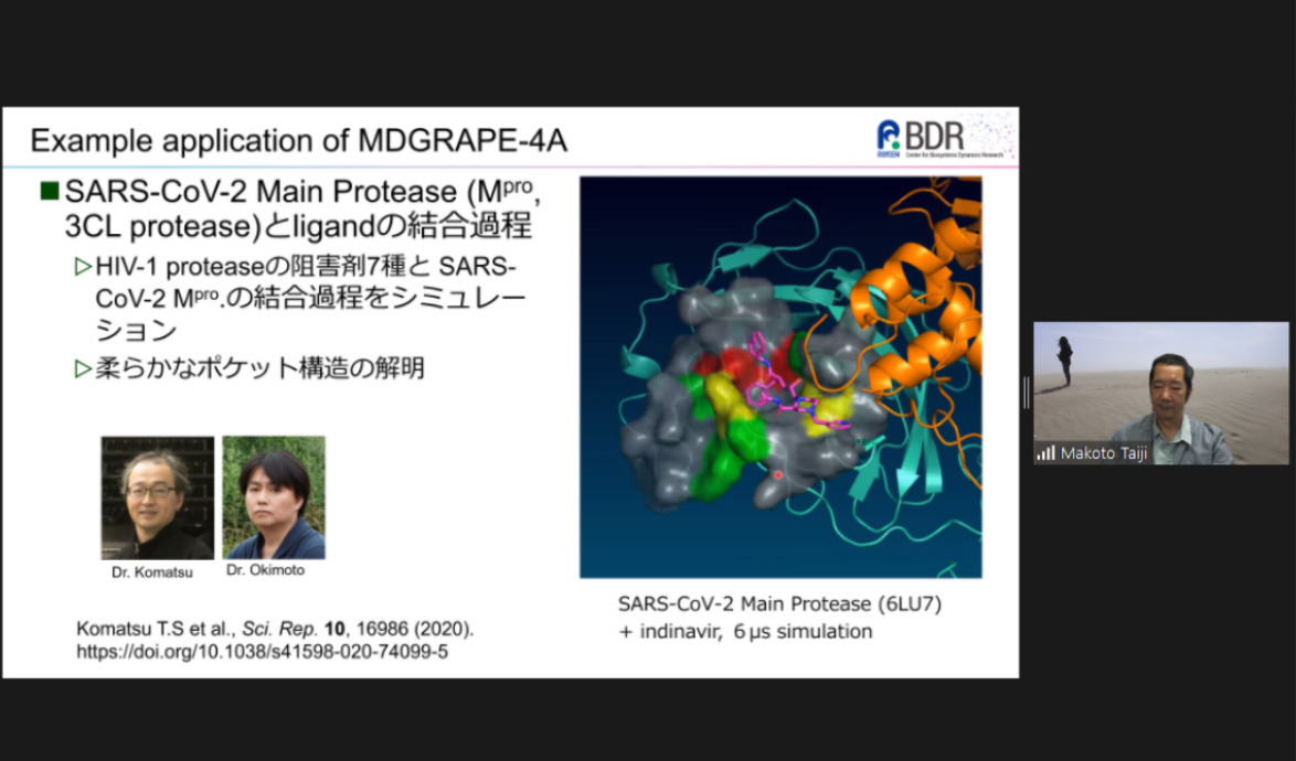 泰地 真弘人 (理化学研究所 生命機能科学研究センター 副センター長) 「分子動力学シミュレーション専用計算機の開発: 我々は近年、分子動力学シミュレーションのための専用計算機「MDGRAPE-4A」を完成させた。MDGRAPE-4Aは、10万原子の系を一日に1マイクロ秒計算することができ、通常の並列計算機の約5倍の性能をもつ。米D. E. Shaw ResearchのAntonの性能には遠く及ばないが、同様のシステム化を達成し動作させることができた。本開発を通じ、今後の高性能計算における細粒度並列化の重要性、ハードウェアによるその支援の必要性がより明確になった。