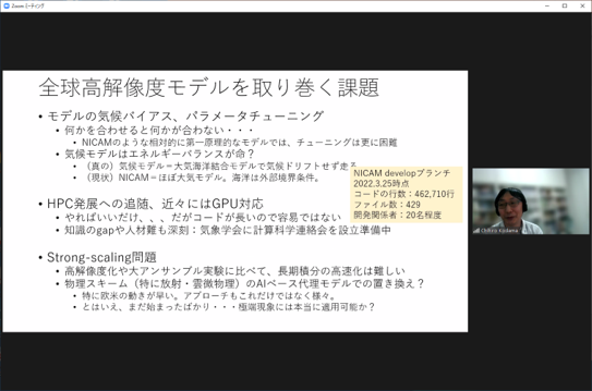 小玉 知央 (海洋研究開発機構 地球環境部門(環境変動予測研究センター) 副主任研究員) 「全球高解像度モデルを用いた気象・気候研究の現状と展望」 気象・気候分野は半世紀以上に渡ってHPCの進歩とともに発展し、HPCを最も利用してきた分野の一つでもある。精緻な天気予報や気候予測に対する社会的ニーズに応えていくためには、限られた資源の中で目的に応じて モデルの解像度や積分期間、アンサンブル数、複雑性を確保する必要がある。本講演では発表者が深く関わっているNICAMグループでの取り組みや最近の国際動向を紹介しながら、全球を対象とする高解像度気象・気候モデルを用いた研究の現状と5-10年程度先の将来展望を述べる。