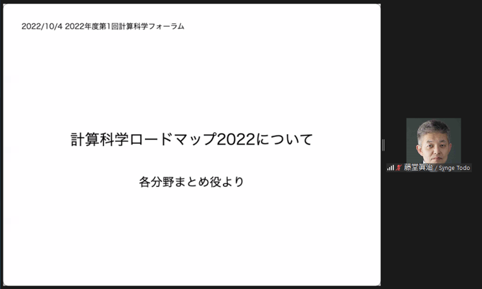 各分野取りまとめ役 「ロードマップ2022 ― 前回からのアップデート」 計算科学フォーラムが中心となり「計算科学ロードマップ2022」の作成を進めていますが、各分野での作業がほぼまとまりつつあります。「計算科学ロードマップ2017」からの変更点を中心に、各分野のとりまとめ状況について報告します。