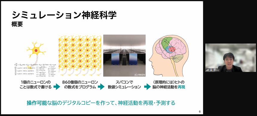 栗山 凜 (電気通信大学大学院 情報理工学研究科 博士課程3年) 「『富岳』を用いた細胞形状を考慮する神経回路の大規模シミュレーション」 脳は、膨大な数の神経細胞が接続し、スパイクと呼ばれる瞬間的な電気信号を交換しながら情報処理を行うネットワークである。個々の神経細胞の挙動は、細胞内の電流の拡散(拡散項)とイオンチャネルと称する様々な非線形機構(反応項)からなる、反応拡散系として記述され、スパイクの伝播は細胞間のビット送受信に相当する。この反応拡散方程式を解きながらビットの送受信を計算することで、脳神経回路の挙動を数値的に再現・予測する、神経回路シミュレーションが可能になる。本発表では、スパコンによる大規模神経回路シミュレーションの概要を紹介後、現在開発中のシミュレータ「Neulite」の「富岳」での高速化事例を紹介する。